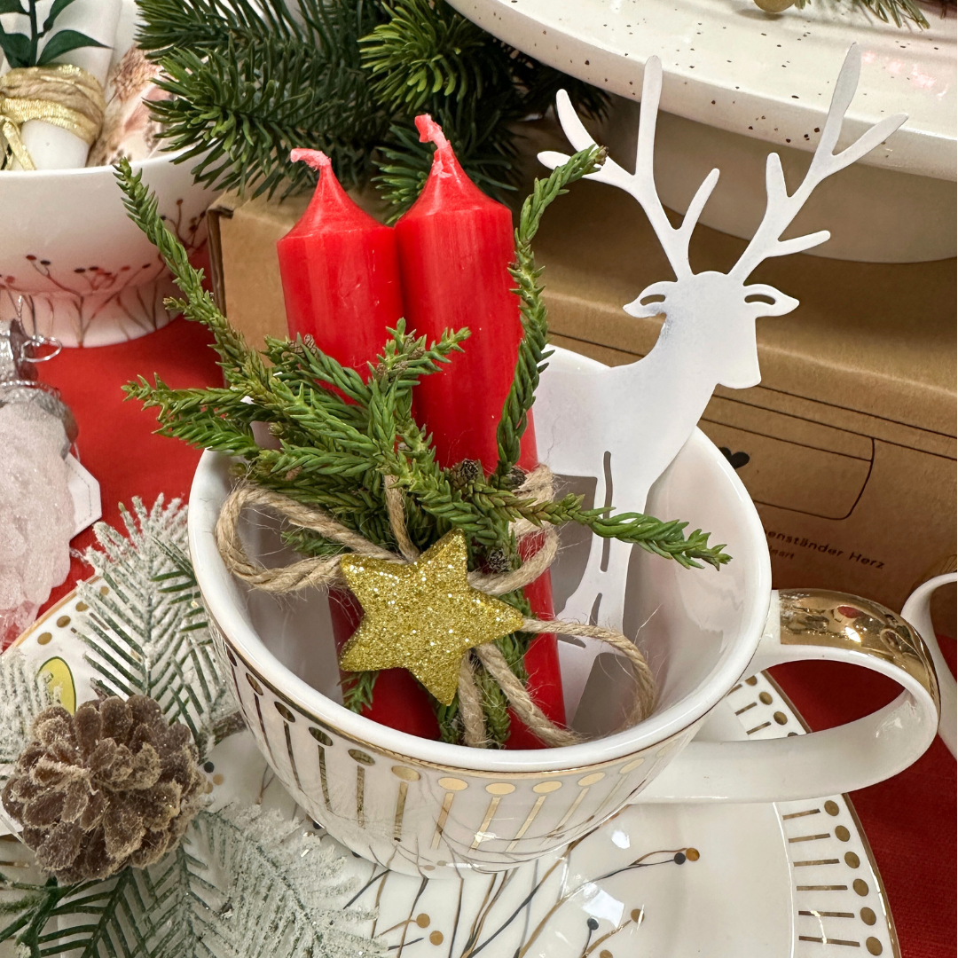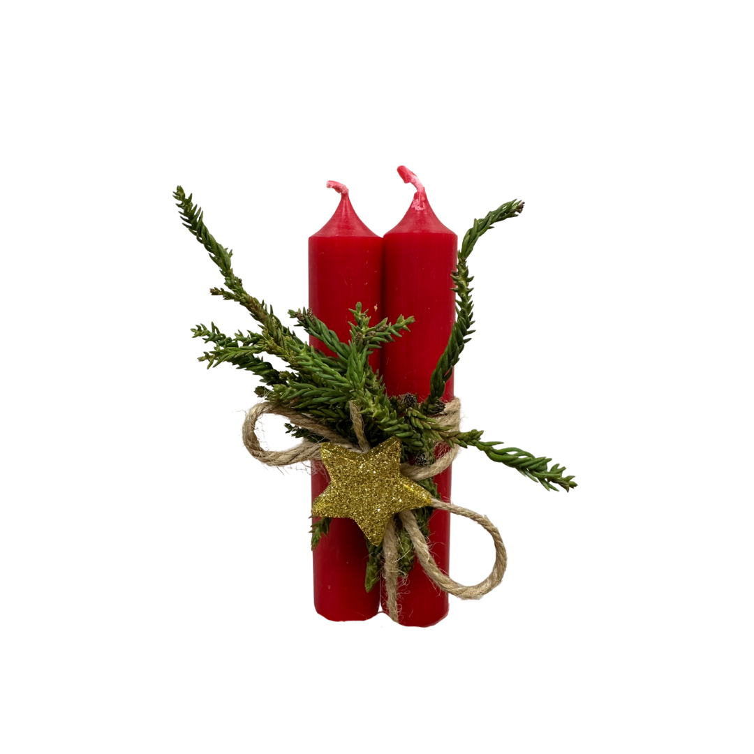 Das weihnachtliche Kerzenset enthält die Baumkerze in Weihnachtsrot, liebevoll verziert mit dekorativem Band, kleinen Accessoires oder weihnachtlichen Anhängern. Ideal als Geschenk, Mitbringsel oder fertiges Deko-Highlight für dein Zuhause.