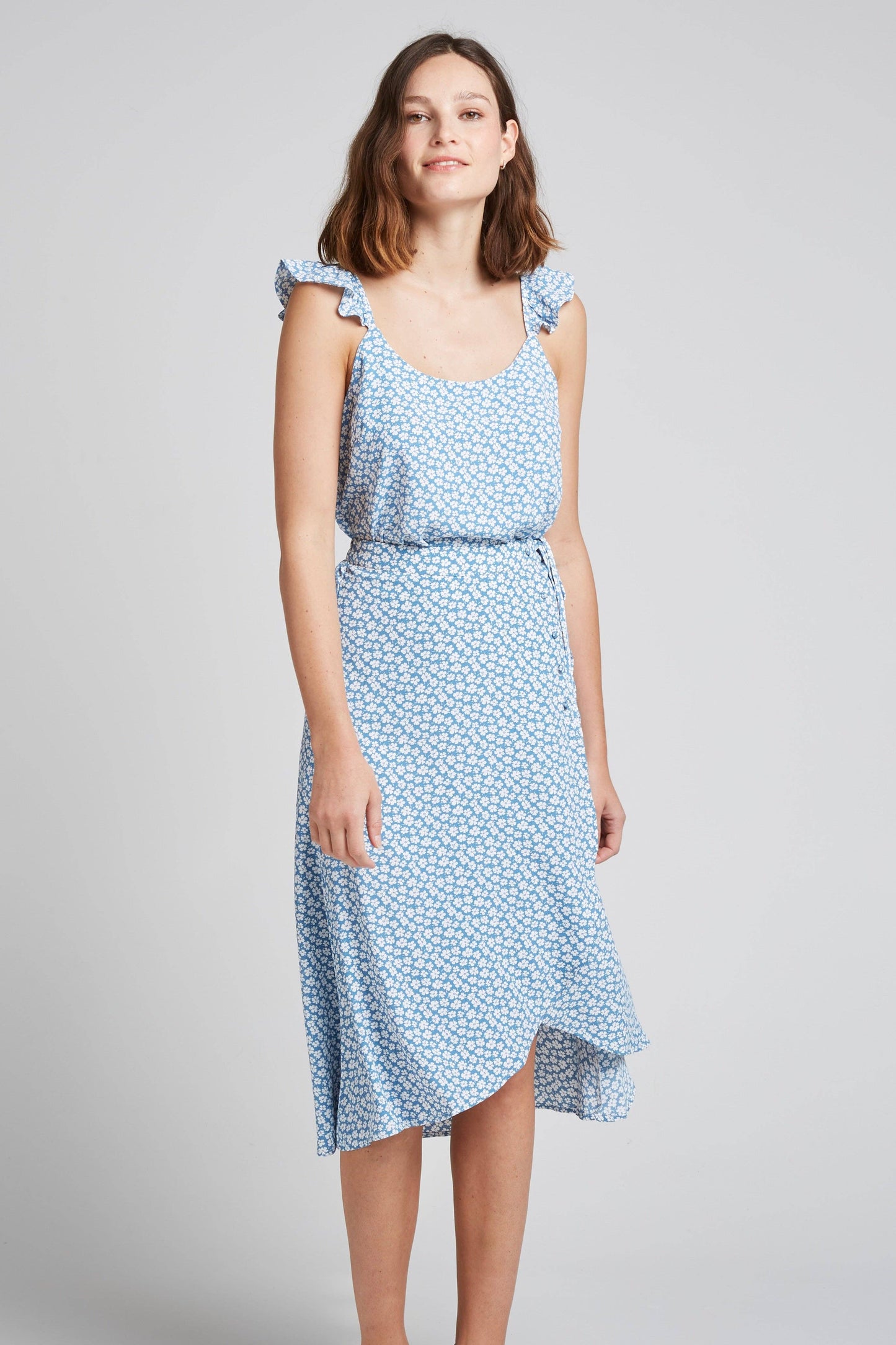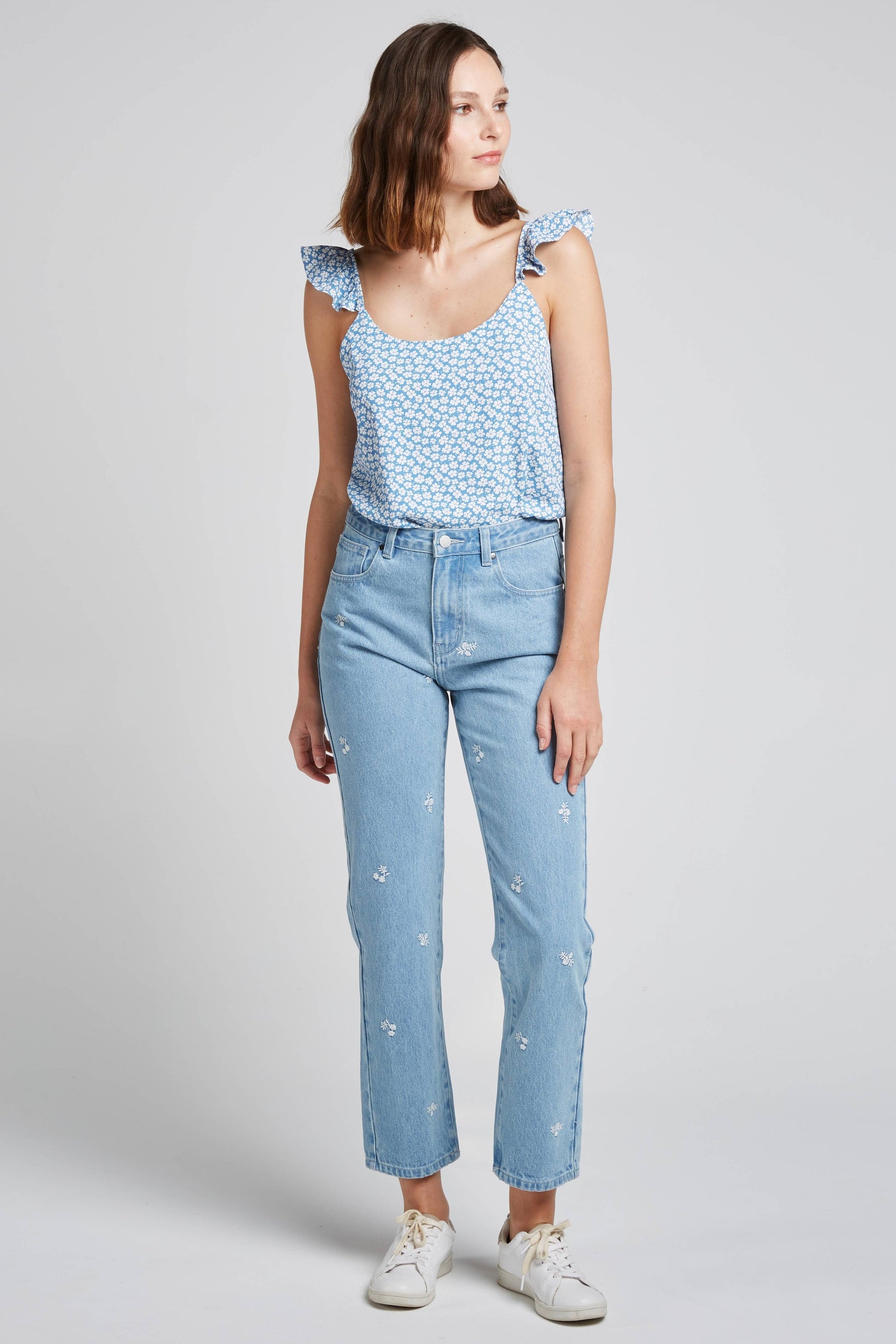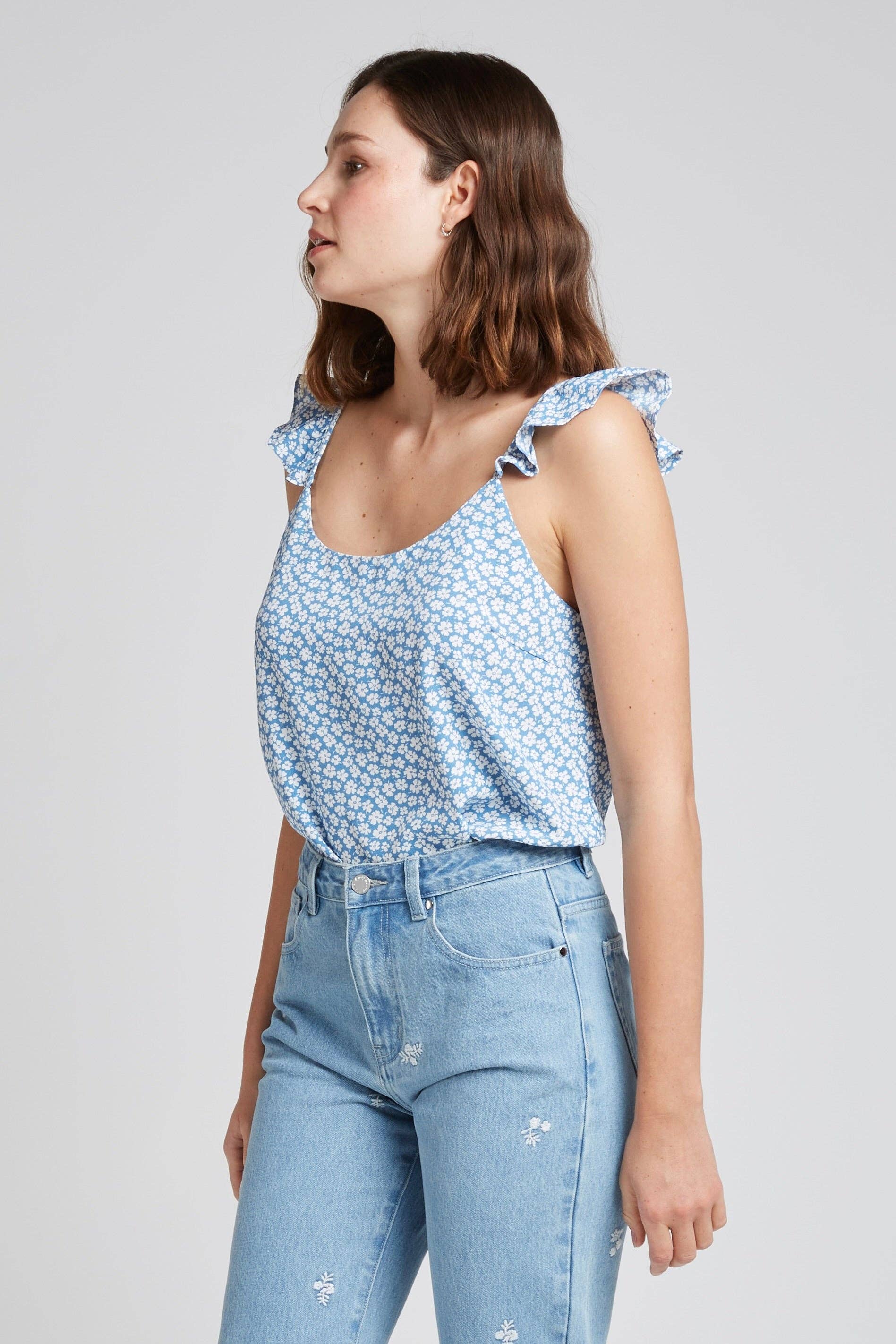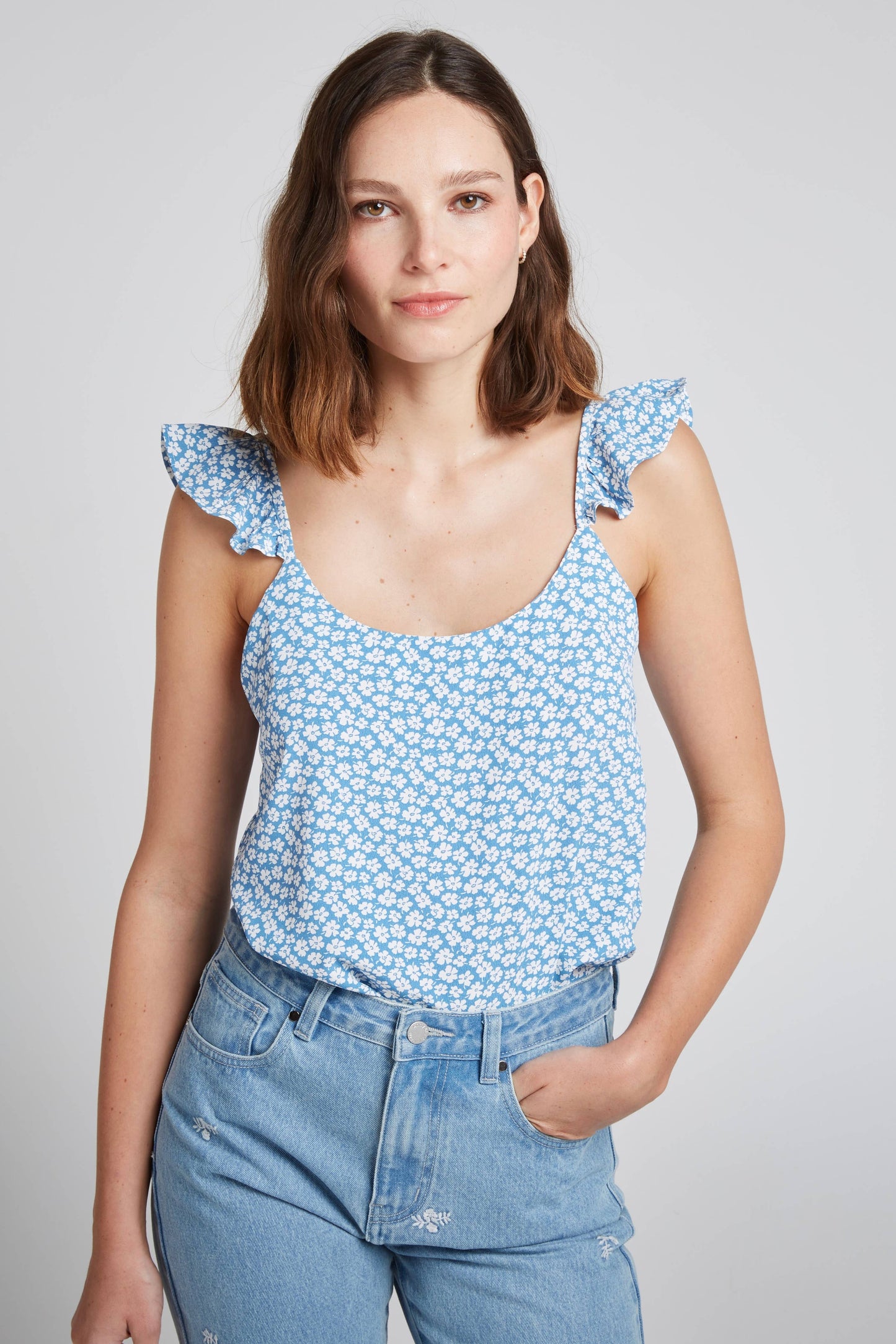 Das Tanktop mit seinen dünnen Trägern und zarten Rüschen ist ein feminines und leichtes Kleidungsstück, ideal für sonnige Tage. Es besteht aus 100% Polyester und bietet große Leichtigkeit und optimalen Komfort. Sein blauer Blumendruck verleiht Ihrem Outfit einen Hauch von Frische und Freude. Dieses Top passt perfekt zu Jeans oder einem Rock für einen sommerlichen und lässigen Look.