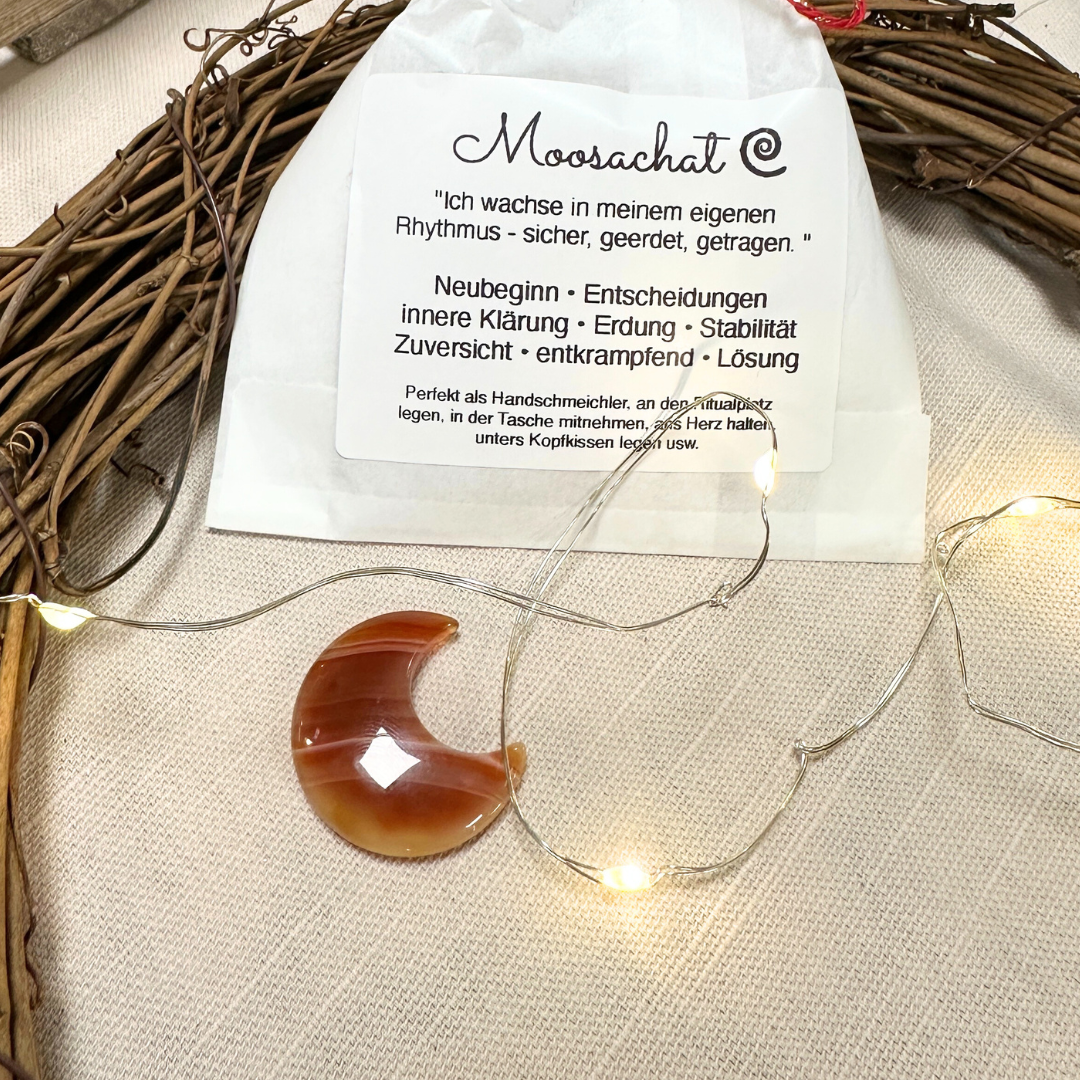 Der Mond steht für Wachstum, innere Zyklen und Veränderung, der Moosachat ergänzt diese Energie mit Erdung, Zuversicht und Vertrauen. Gemeinsam erinnern sie daran, im eigenen Rhythmus zu wachsen und Entscheidungen aus innerer Klarheit heraus zu treffen.