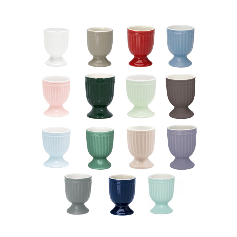 Die Eierbecher von GreenGate wecken das Gefühl von einem reichlich gedeckten Frühstückstisch mit leckeren, warmen, frischen Bio-Eiern! Kombiniere das Geschirr von GreenGate mit den verschiedenen Mustern und Farben. Die Philosophie hinter dem Geschirr liegt darin, nach Herzenslust alles zu mixen, Freude zu haben und zu teilen, leckere Speisen zu genießen und jeden Tag das Leben zu genießen.