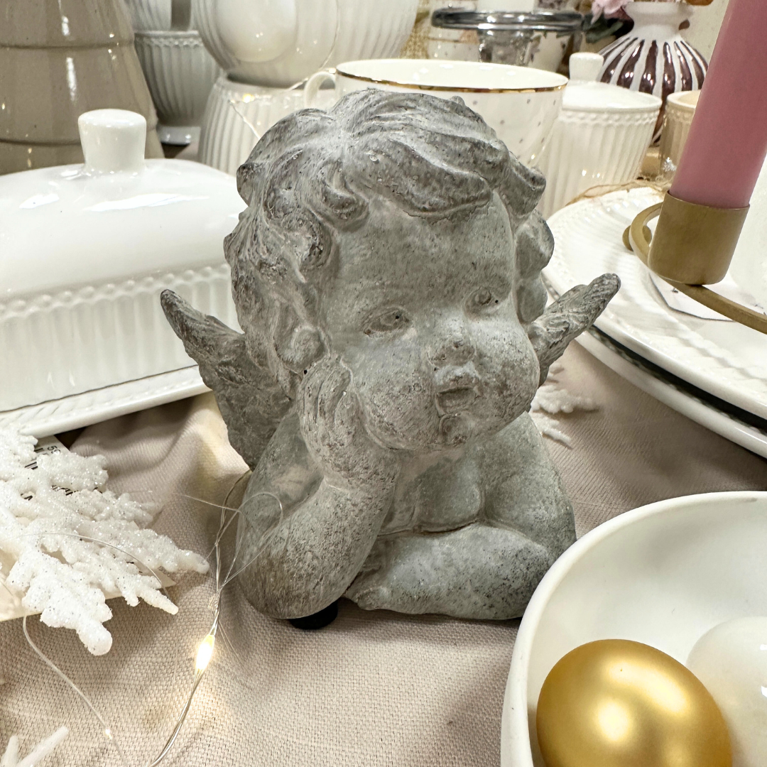 Dieser liebevoll gestaltete Engelkopf aus Beton bezaubert durch seine kindliche, friedvolle Ausstrahlung. Der kleine Engel stützt seinen Kopf sanft auf die Hände – ganz verträumt und in sich ruhend. Seine typische, rundliche Engelsform erinnert an klassische Puttenfiguren aus alten Zeiten und verleiht deiner Dekoration einen zarten Vintage-Charme.