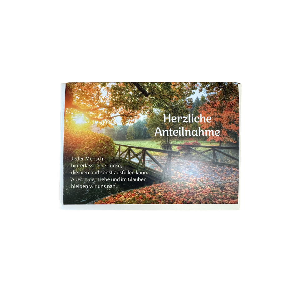 Die Trauerkarte „Herzliche Anteilnahme“ ist eine stilvolle Möglichkeit, Mitgefühl auszudrücken. Mit ihrem ruhigen Naturmotiv und dem einfühlsamen Text spendet sie Trost und hilft dabei, in schweren Zeiten die richtigen Worte zu finden.