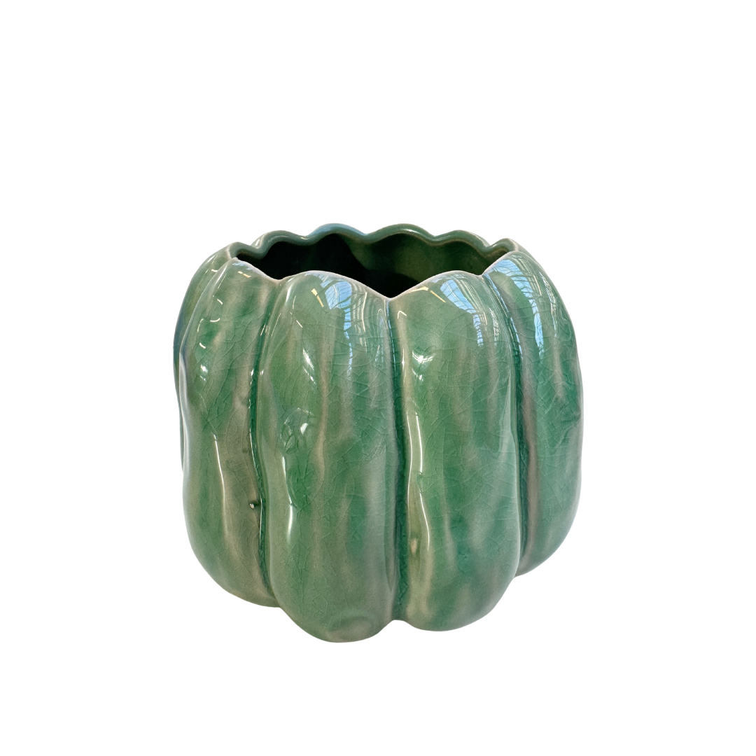 Die glänzende Glasur bringt Tiefe und Lebendigkeit in das Grün und lässt das Licht sanft über die Oberfläche wandern. Die organische Form erinnert an natürliche Strukturen und fügt sich harmonisch in Scandi-, Natur-, Boho- oder moderne Wohnstile ein.