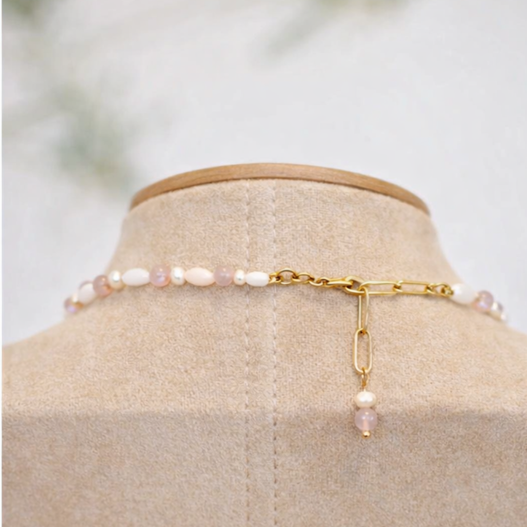 Perlenkette Damen aus Rosenquarz & Süßwasserperlen