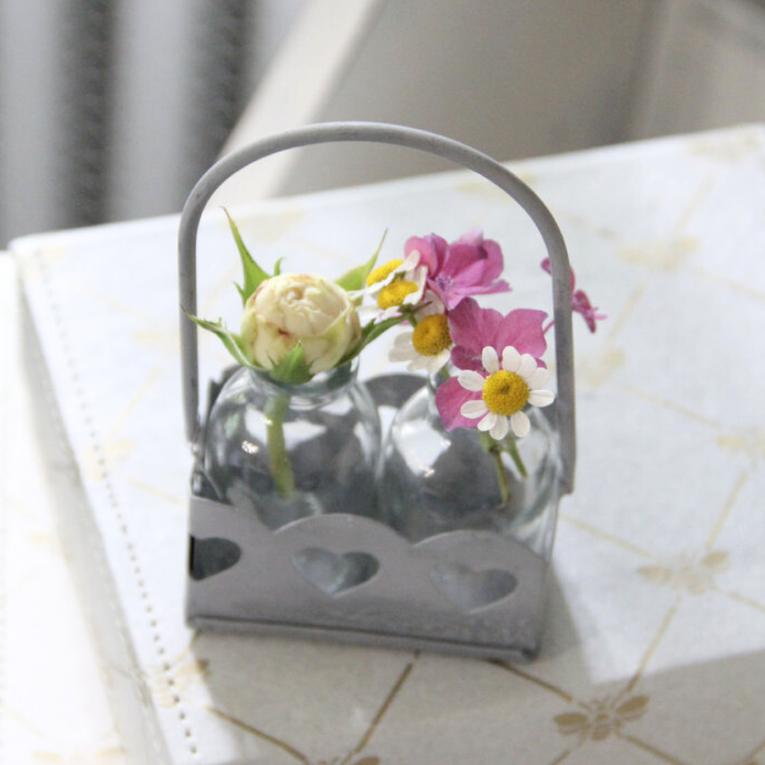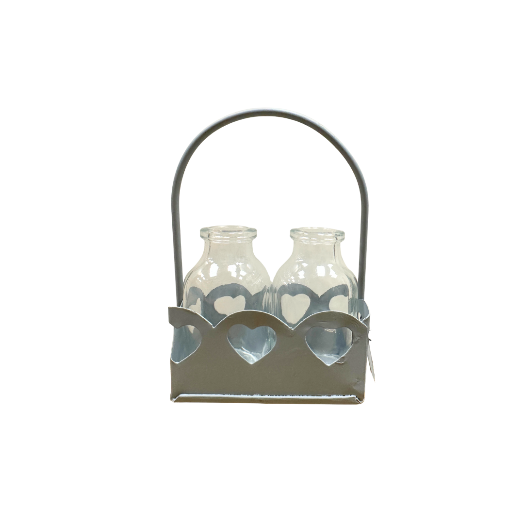 Dieser dekorative kleine Metallhalter mit Glasvasen ist ein vielseitiges Wohnaccessoire für liebevolle Tischdekorationen, Blumenarrangements und stilvolle Akzente. Zwei kleine Glasvasen sind sicher in einem schlichten Metallrahmen eingefasst und lassen sich dank des Henkels flexibel platzieren oder dekorativ tragen.