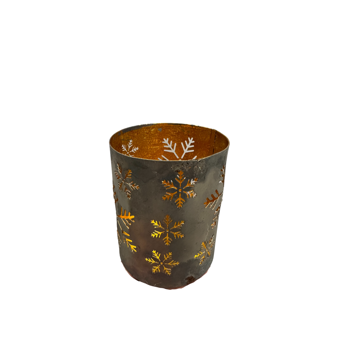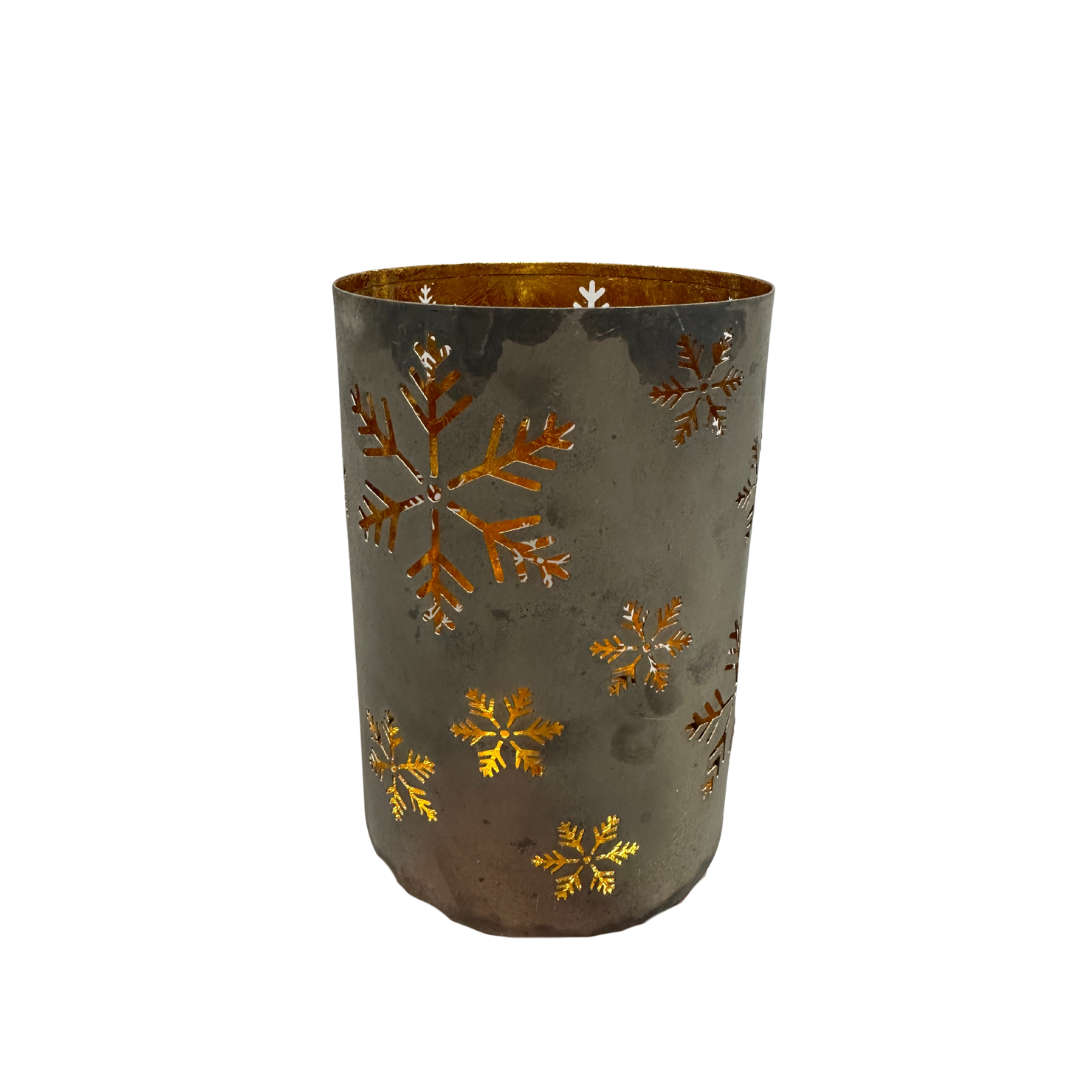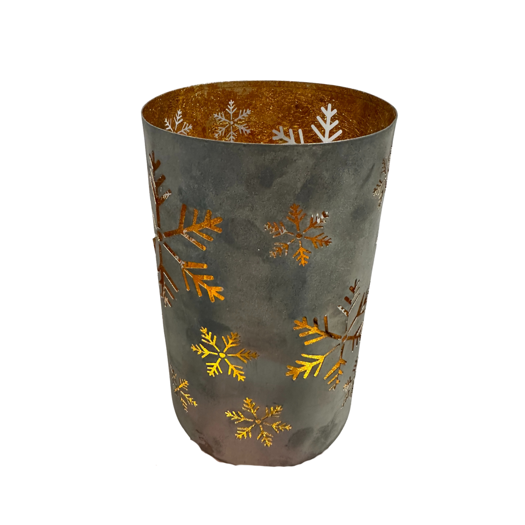 Die Laterne ist in einem stilvollen Silber im Used-Look gearbeitet und hat feine Schneeflocken-Ausschnitte, durch die das Kerzenlicht wunderbar warm hindurchschimmert. Innen zeigt sie sich in einem strahlenden Goldton, der das Licht zusätzlich reflektiert und für ein besonders gemütliches, weiches Leuchten sorgt – fast so, als würde ein kleiner Winterstern in deinem Zuhause glühen.