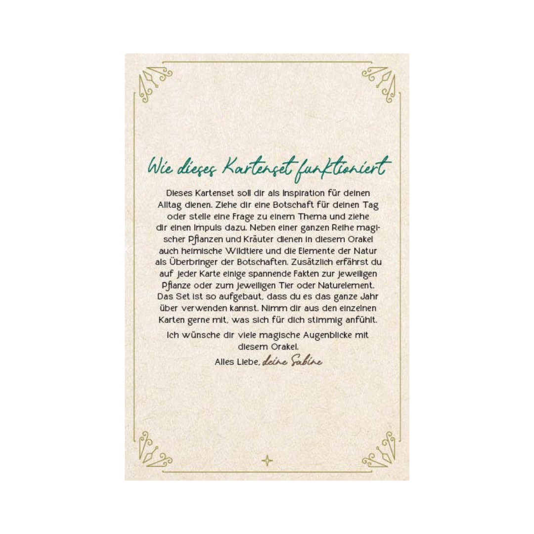 Dieses Orakel verbindet die Kraft der Tier- und Pflanzenwelt mit den Botschaften des Universums. Jede Karte schenkt dir eine inspirierende Eingebung und hilft dir dabei, wieder in Verbindung mit deiner inneren Stimme zu kommen. Die grünen Botschaften begleiten dich sanft durch den Alltag und unterstützen dich bei Themen wie:
