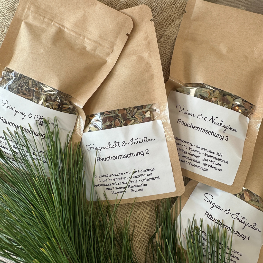 Die vier handgemachten Räuchermischungen für die Rauhnächte wurden mit viel Sorgfalt, in liebevoller Handarbeit und aus hochwertigen Bio-Zutaten eines deutschen Zulieferers zusammengestellt. Jede Mischung ist speziell auf die jeweilige Phase der Rauhnächte abgestimmt – von Vorbereitung und Innenschau über Vision und Neubeginn bis hin zu Integration und Segen.