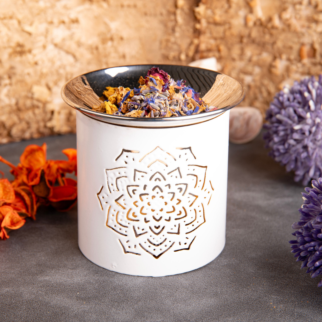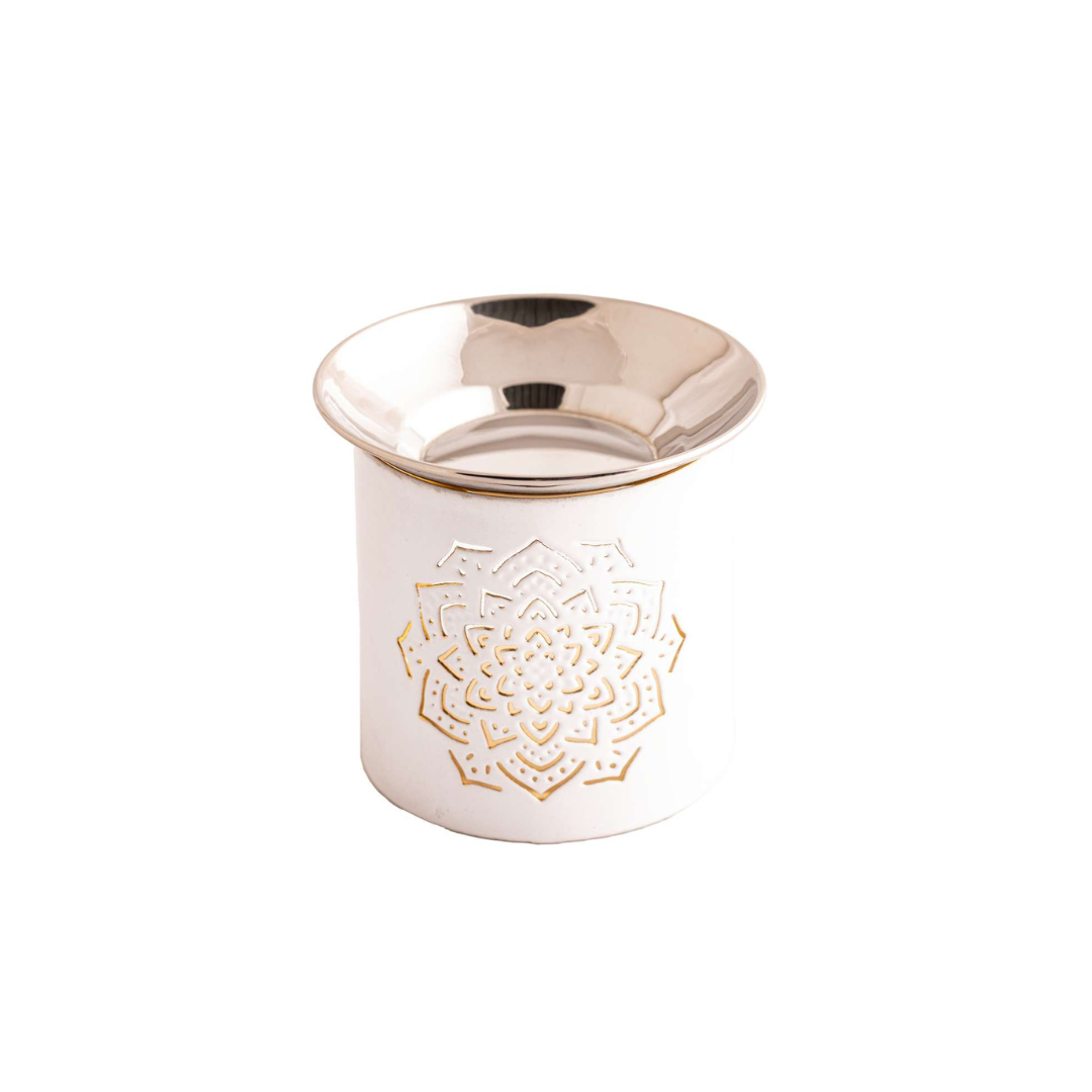 Dieses edle Räucherstövchen aus weiß-goldenem Metall verbindet Funktionalität, Ästhetik und Symbolkraft in einem einzigen Alltagsritual. Das filigran ausgestanzte Mandala-Motiv verleiht dem Stövchen eine harmonische, spirituelle Ausstrahlung – bei brennender Kerze wirft es ein warmes, atmosphärisches Lichtspiel in den Raum.