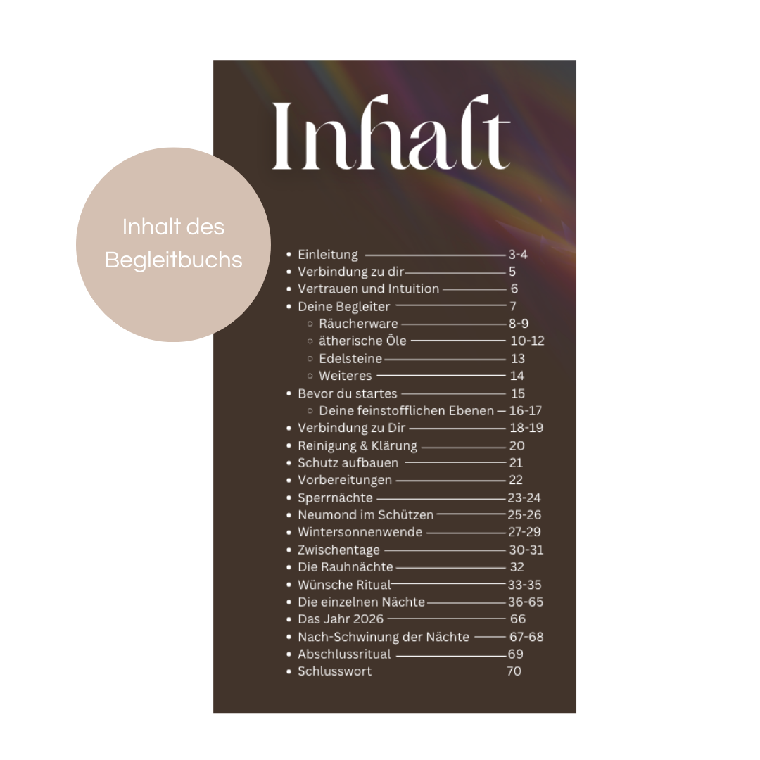 Mit dem digitalen Workbook „Rauchnachts Seelenpfade“ erhältst Du eine liebevoll gestaltete Begleitung. Dieses Jahr komplett überarbeitete und erweitert – voller neuer Inhalte, Rituale, Reflexionen, spiritueller Impulse und Anleitungstexte, die Dich achtsam durch diese besondere Schwellenzeit tragen.