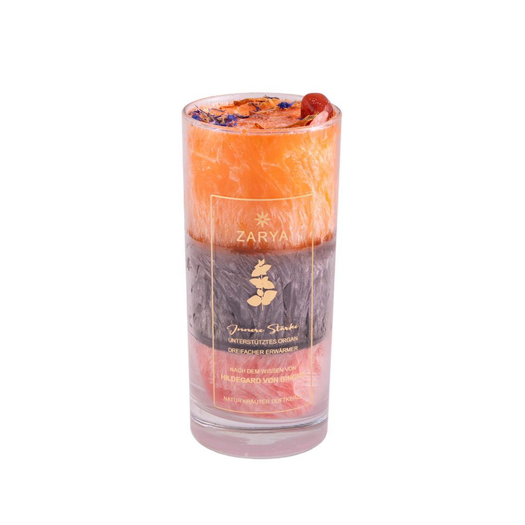 Diese Ritualkerze ist eine Besonderheit. Sie unterstützt unsere innere Stärke, aktiviert dein Energiefeld und gleichzeitig „der dreifache Erwärmer“ . Auf der spirituellen Ebene ist der dreifache Erwärmer für die seelische Wärme sowie die Fähigkeit, Geborgenheit zu geben und zu empfinden, verantwortlich. Auf der körperlichen Ebene regeneriert der dreifache Erwärmer den Körper und optimiert dessen Wärmehaushalt. Das allgemeine Immun- und Verdauungssystem wird dadurch aufrechterhalten und gestärkt. Der Duft und die Optik der Kerze, sowie ihre besondere Zusammensetzung sind ein absolutes Highlihct.