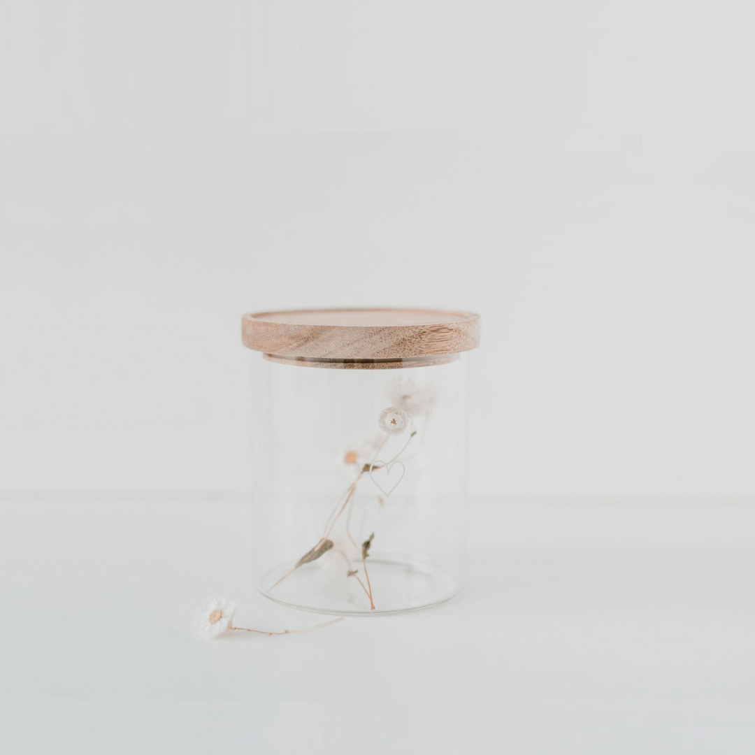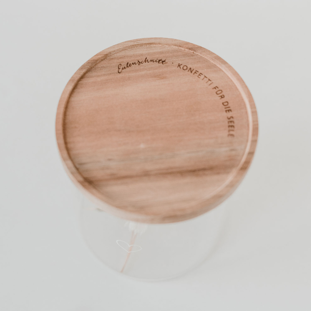 DiesesVorratsglas hat es in sich! Dezent, ästhetisch und natürlich. Das Design ist perfekt für alle Freunde schöner Dinge. Du kannst das kleine Glas für deine Vorräte nutzen, für Utensilien im Bad oder Büro, für kleine Geschenke oder du stellst das Glas auf das Holz und nutzt es als wunderschönes Windlicht. Der Einsatz des Glases von Eulenschnitt ist so vielfältig und zauberhaft, dass es ein Muss ist, in deinem gemütlichen Zuhause!
