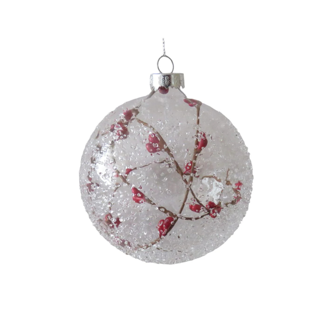 Edle Weihnachtskugel aus klarem Glas mit roten Beerenzweigen und Eisoptik