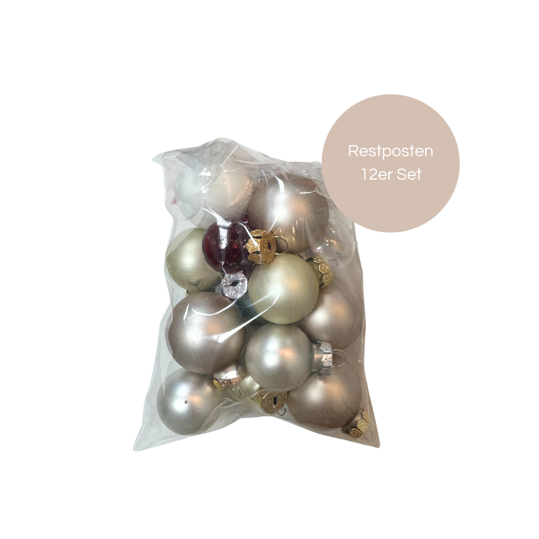 Dieses liebevoll zusammengestellte Set kleiner Weihnachts-Glaskugeln vereint unterschiedliche Formen, Farben und Größen zu einem harmonischen Gesamtbild. Die Kugeln stammen aus Restgrößen und Restfarben, sind makellos und unbeschädigt – lediglich als Einzelstücke zusammengefasst, die sonst keinen festen Platz mehr gefunden hätten.
