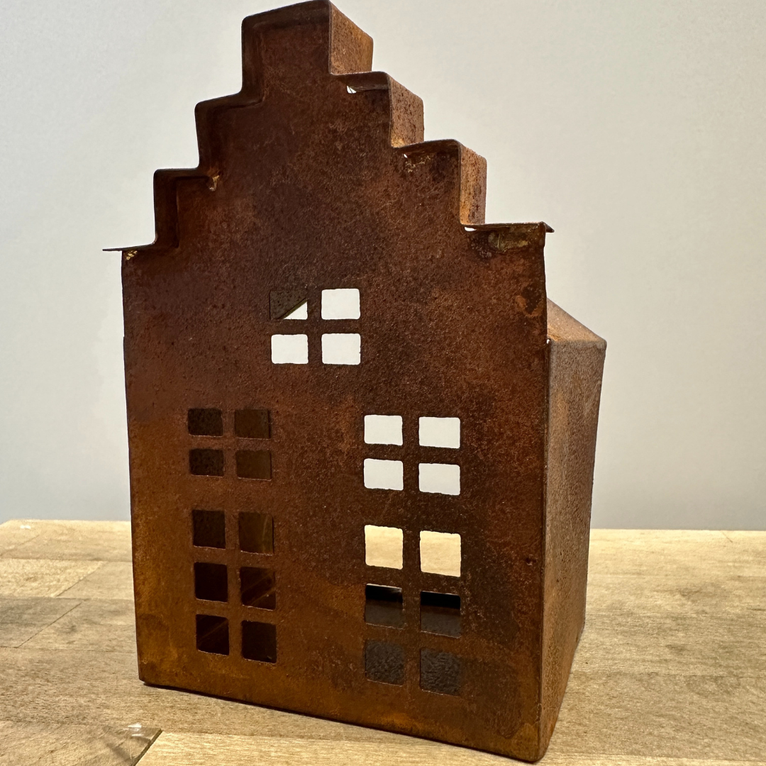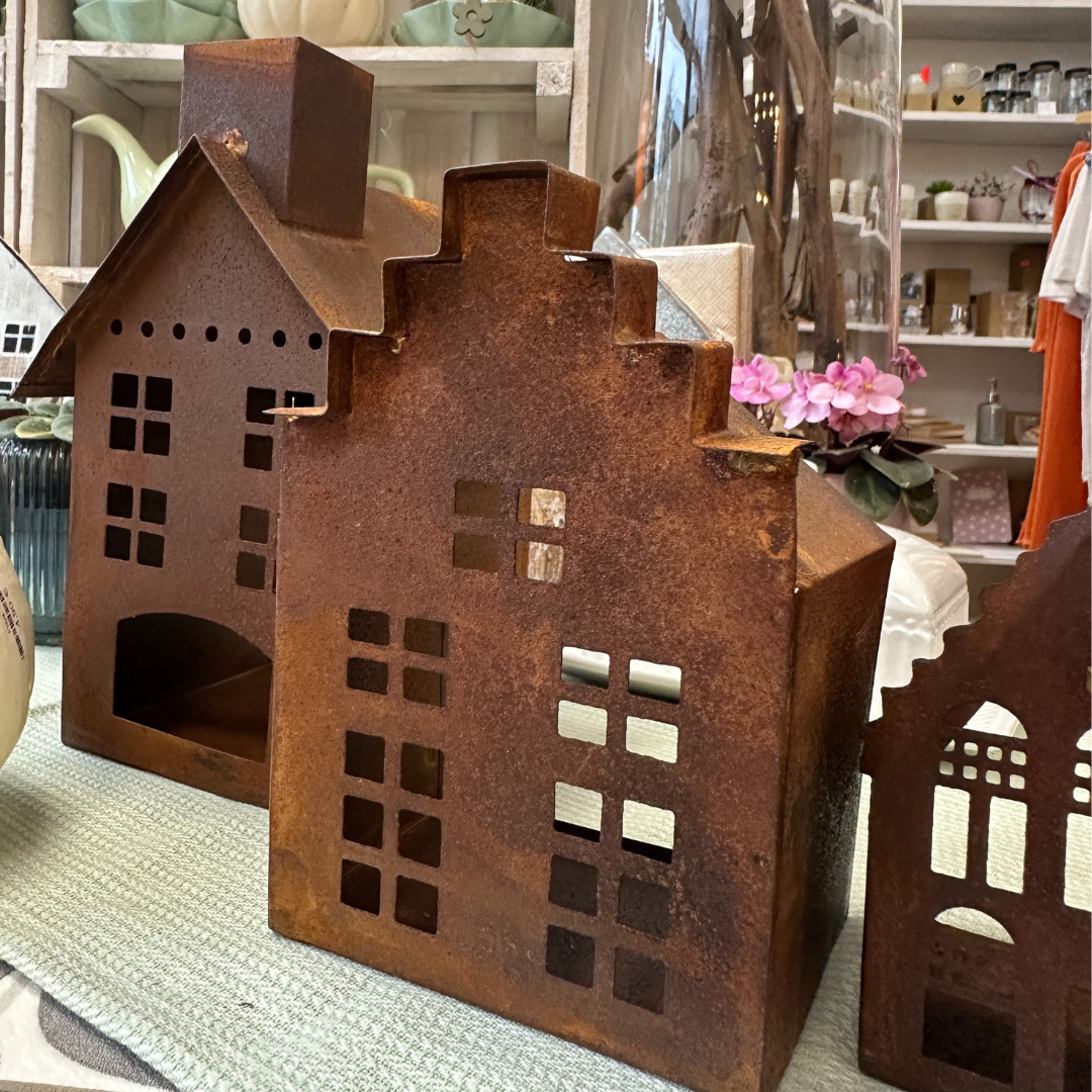Mittleres Windlicht-Haus aus Metall in Rostoptik