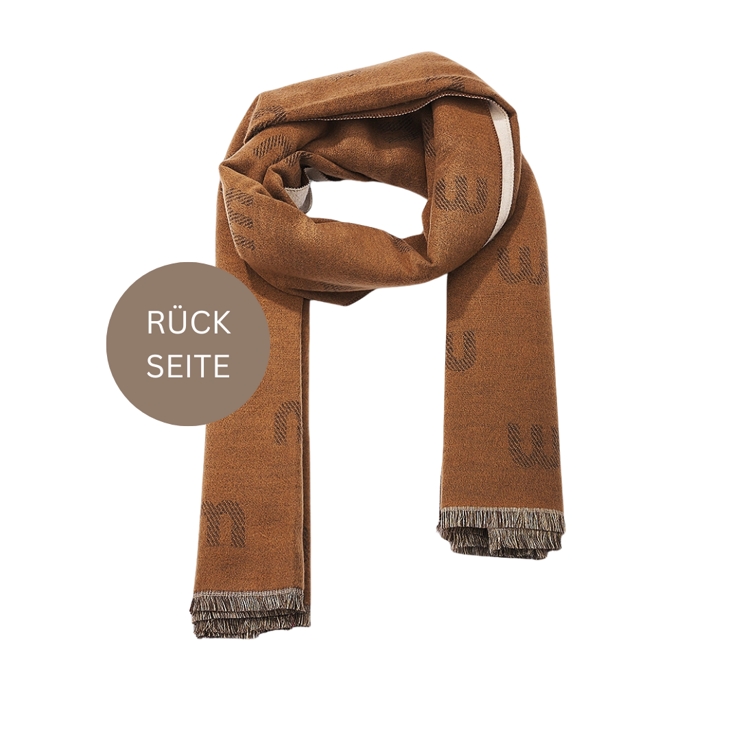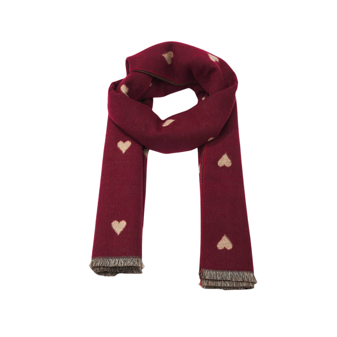 Ein Accessoire mit Herz: Dieser herzgemusterte Wollschal vereint Wärme, Stil und Vielseitigkeit in einem zeitlosen Design. Die Vorderseite zeigt sich in elegantem Bordeaux mit hellen Herzen, während die Rückseite mit braunen, geometrischen Mustern überrascht – ein wendbares Design, das dir zwei Looks in einem bietet.